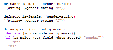 An important practical usability concern arises here. If we build a system like this, who will design the template text and who will implement the grammar? Assuming that our end-user is XYZ Lab, it is fair to expect that they will prepare the template text because they know the domain and vocabulary. What about the Grammar file? Obviously, we cannot expect them to hire Lisp programmers, or needlessly outsource that task to another agency! Well, this can be handled by implementing a good front-end as part of the NLG system, which will be used by the team at XYZ Lab to specify the static text and embed meta representations of synonyms, paraphrased text and formula-based dynamic text schema. And because this is all Lisp, it is quite straightforward to generate the appropriate grammar on the fly!