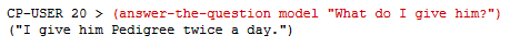 Also, the system will print the complete matching sentence(s) even though the answer is contained in a part of the sentence. Thus, when asked the question What does Peter eat?, the system will respond Peter eats a lot of sweets even though he is diabetic, and not just Peter eats a lot of sweets.