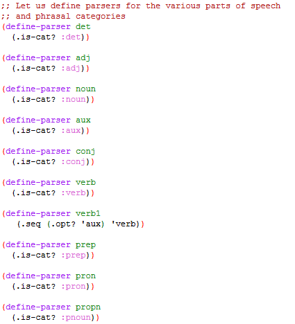By the way, the .is-cat? parser I have written is slightly different from the library-provided .is, in that the latter only expects a single token type from the lexer, whereas .is-cat? permits multiple types (in our case, POS types).