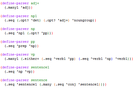 The library has a macro called define-parser that allows us to define a parser combinator by stitching together other parsers. This comes in quite handy.