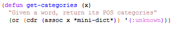For each word, the lexicon associates a list of possible parts of speech corresponding to that word. The get-categories function, called by the lexer, looks up a word in the lexicon, and if found, returns the corresponding POS list.