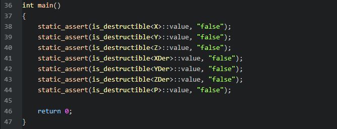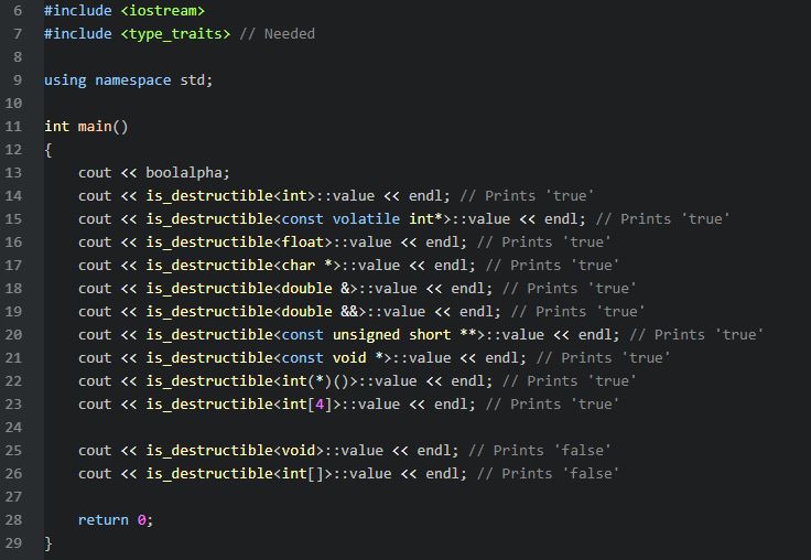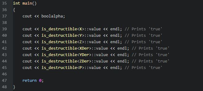 Some of you may be wondering if std::is_destructible depends on compile time or run time check. The answer is that this is purely a compile time check! Isn’t that interesting? Look at the modified main below: