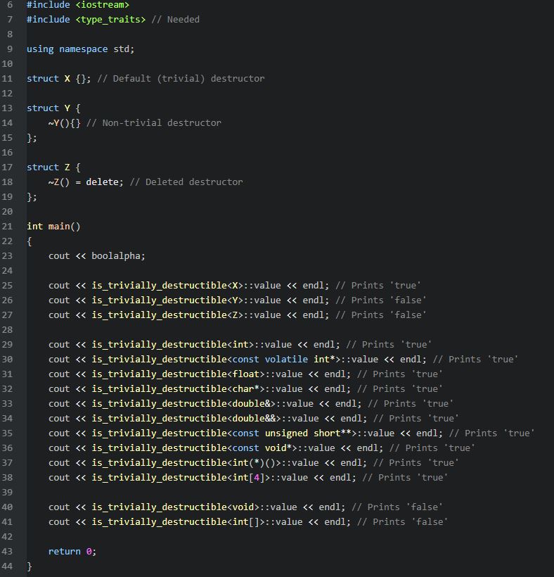 Hope you understand why line 27 generates false. The class Z has a deleted destructor and so it cannot be destroyed. So, if std::is_destructible is false, then so is std::is_trivially_destructible.