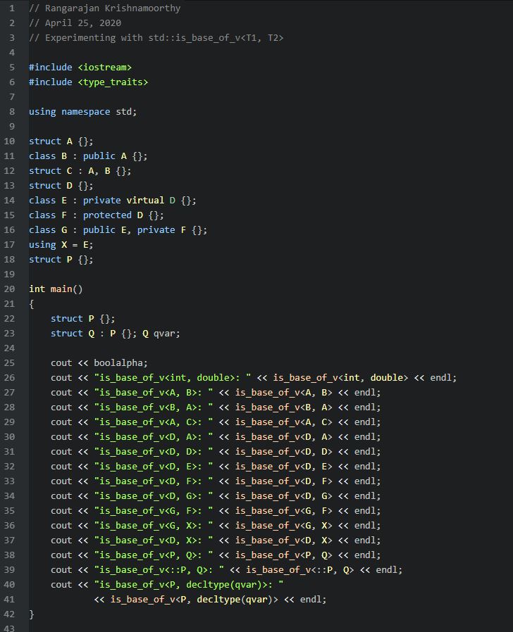 Let us look at an example covering various cases. For convenience, we will use the construct std::is_base_of_v<T1, T2> instead of std::is_base_of<T1, T2>::value.