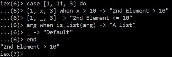 Elixir differs from most other programming languages in that it supports patterns (instead of simple conditions) in the “case” statement. Here is an example: