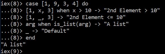 Notice how we use a “guard” along with the first pattern to check if the second element of the list is greater than 10. The second pattern matches any element in the second position of the list. The third pattern only checks if the expression is a list without considering its internal structure. The last condition will match anything that hasn’t matched the earlier three patterns. In this case, the given list “[1, 11, 3]” matches the first pattern.