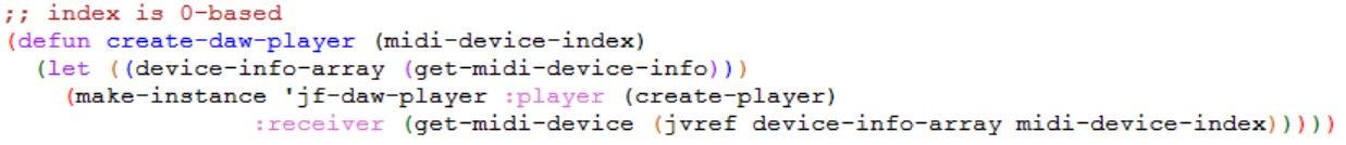 For this, as well as to create a new MusicReceiver, I had to declare additional Java methods in Lisp: