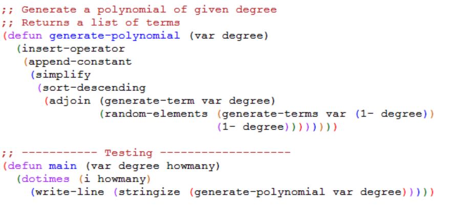 Here is the primary function generate-polynomial along with the tester function (main):