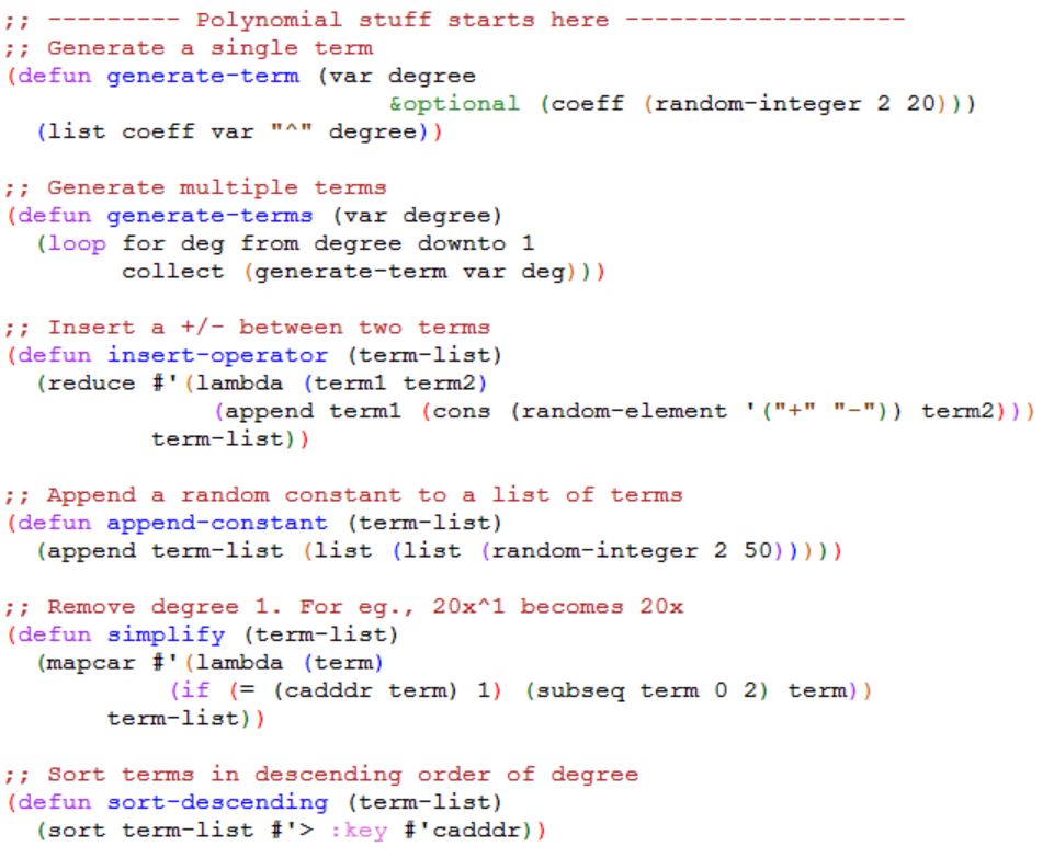 In my last article, I showed how we can use Prolog to generate univariate Polynomials. After I finished that article, I wanted to try Lisp for the same task. Prolog is “declarative”, whereas Lisp is primarily “functional” (it supports OOP as well), so the implementation will exhibit that difference.